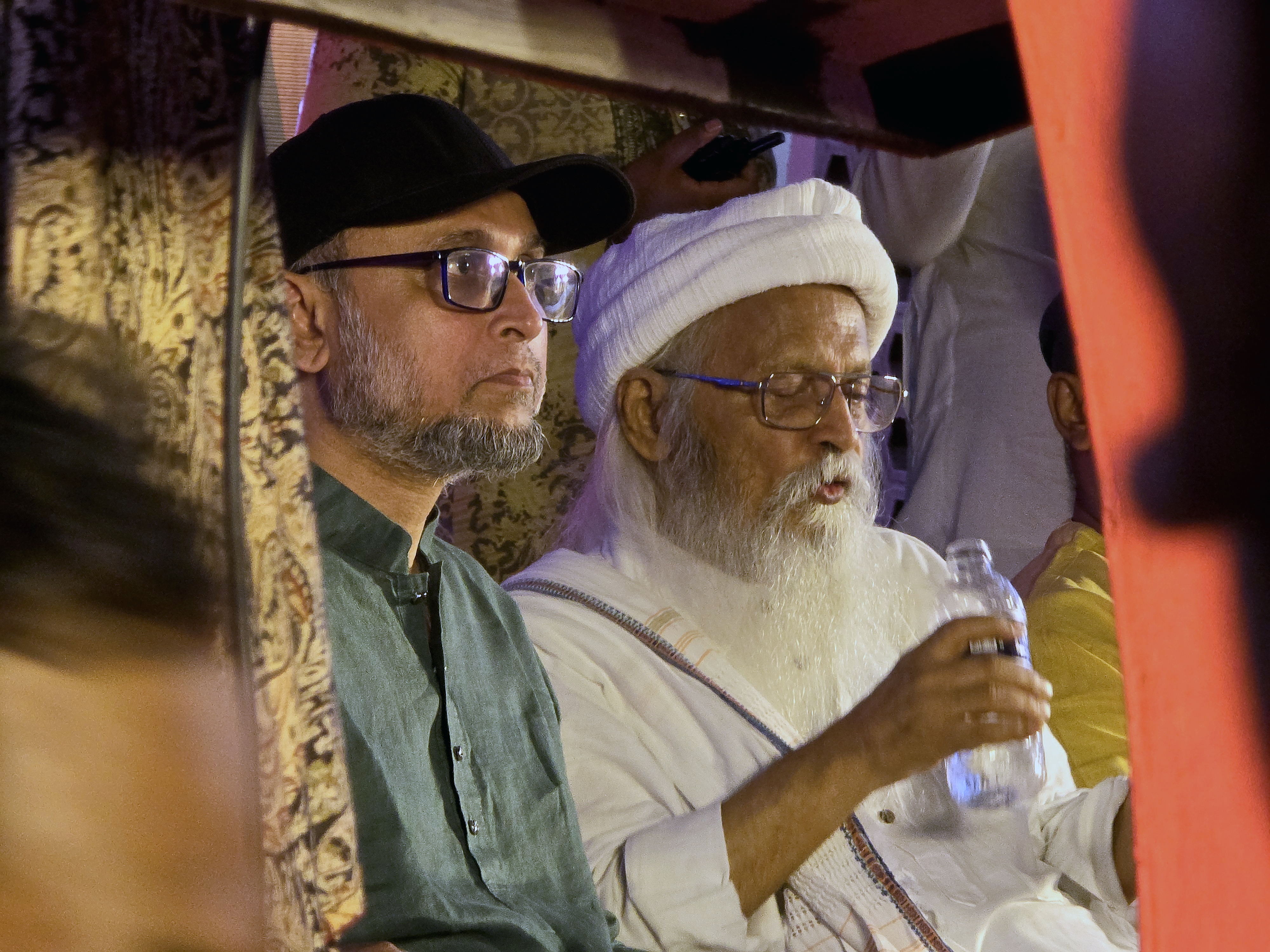 এপ্রিলে ঢাকার মিরপুরে হযরত শাহ আলী বোগদাদীর (রহ.) প্রাঙ্গণে আয়োজিত এক অনুষ্ঠানে পাশপাশি বসে আছে অন্তবর্তী সরকারের সংস্কৃতি উপদেষ্টা মোস্তফা সরয়ার ফারুকী এবং কবি ও রাষ্ট্রচিন্তক ফরহাদ মজহার। ১১ এপ্রিল ২০২৫। ছবি: ওয়ানম্যান নিউজরুম